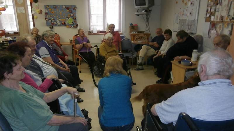 Ve středu odpoledne přišla do domova canisterapeutka p.Sokolová se svojí fenkou zlatého retrívra Sárou. Obyvatelé se s na ni již těšili v ,,ergu"-místnosti volnočasových aktivit. Vyprávěly se psí historky, zážitky z chování pejsků v bývalých domovech a hlavně se mazlilo se Sárou. Těšíme se zase za měsíc.