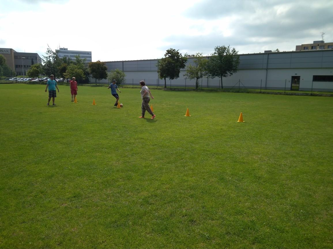 Ve čtvrtek 7. 6. 2018 jsme po roce vyrazili ven na fotbalové hřiště s našimi fotbalisty a příznivci sportu. Bohužel na tak velké hřiště nemáme dostatek hráčů, proto jsme využili venkovních podmínek k tréningu přihrávek a střelby na bránu. Hráči si nejvíc užili slalom mezi kuželi s míčem. Na hřišti panovala dobrá nálada.