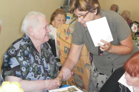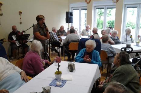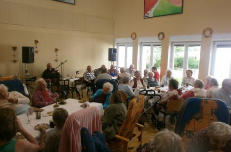 Červnová kavárnička byla opět veselá. Zahrát nám na harmoniku přišel náš dobrovolník pan Josef Talián. Ke kávě se podávaly jablečné rohlíčky, které dopoledne obyvatelky napekly. Při kavárničce se rozdávaly pamětní listy z Výstavy ručních prací v Lysé nad Labem, které jsme se s výrobky také zúčastnili.