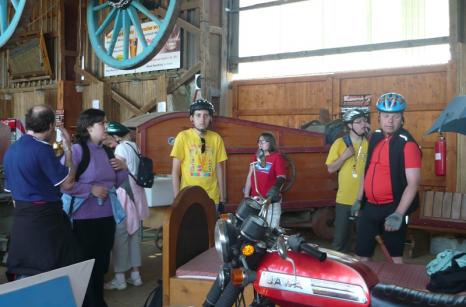 Cyklisté vyjeli kolem deváté hodiny z DST směrem na Mutěnice, Radošovice, okolo řeky Volyňky, směrem do Zborovic. Nad řekou Volyňkou u skalnatého útesu jsme se zastavili a prohlédli filmové místo, kde byla natočena část filmu Slunce, seno… Pak jsme pokračovali k jezu u Strunkovic. Zde byla první svačinová přestávka. Trasa pokračovala po cyklostezce směrem do Hoštic. Během trasy jsme si všímali krásných šumavských výhledů a scenérií. Po prudkém stoupání jsme statečně dojeli do Hoštic.