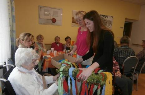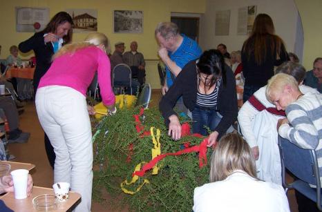 Všichni společně na májku připevnili stuhy a nazdobený věnec. Když bylo vše hotové, doprovodili ji zpěvem do dvora domova. Naší „společnou májku“ nikdo v noci hlídat nemusí. Je totiž symbolem vzájemné pomoci a soudržnosti strakonických seniorů.