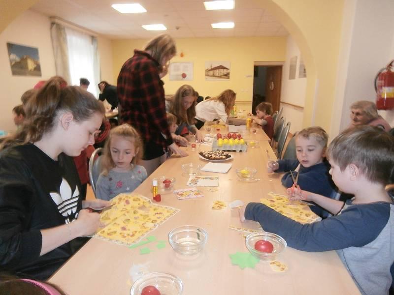 Úterý dopoledne bylo radostné tvůrčí dopoledne plné dětského štěbetání, doplněné poutavým vyprávěním p. etnografky Novotné o tradicích, hrou na dudy a zpěvem. Při tom si děti i senioři zdobili vajíčka , vyráběli na ně papírové košíčky , pletli s dopomocí zaměstnanců pomlázky a učili se i plést košíčky a slepičky z papírového pediku . K tomu skvělá přátelská atmosféra .Dopoledne se zkrátka vydařilo.