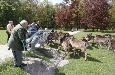 V zámeckém parku chovají pávy a daňky. Pro daňky jsme měli s sebou připravené nasušené pečivo.