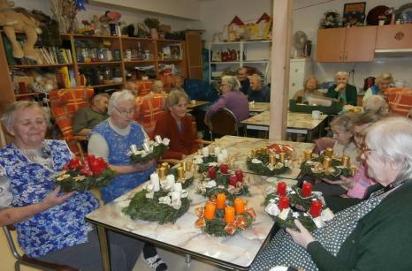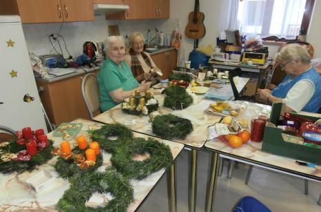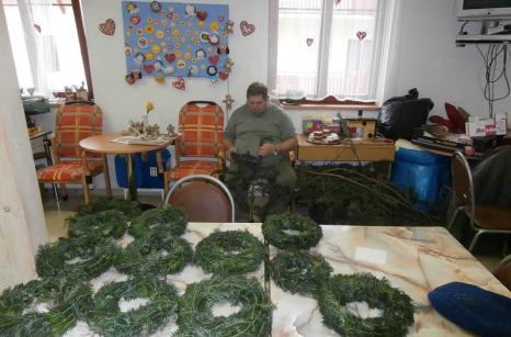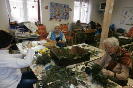Uživatelé Domova pro seniory v Lidické ulici v úterý 26. listopadu vyráběli adventní věnce. Jedlovým chvojím obvazovali slaměné korpusy a korpusy z novinového papíru, které si vyrobili předešlý den v místnosti volnočasových aktivit. Adventní věnečky ozdobili svíčkami, stuhami a vlastnoručně vyrobenými sádrovými přízdobami. Věnečky budou zdobit nejen jídelnu a společenský sál v domově, ale také je bude možné s dalšími vánočními výrobky uživatelů získat v Řepici na adventních trzích.