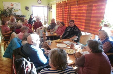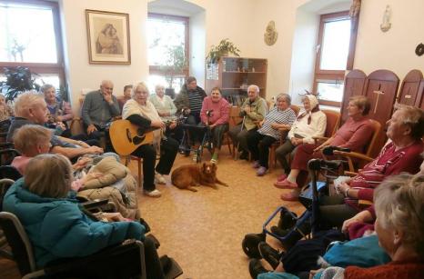 V Sousedovicích návštěvu ze strakonického Domova pro seniory mile přivítali uživatelé i zaměstnanci a připravili pro ně bohatý program - povídání u kávy, zpívání veselých písniček s harmonikou, kytarou i interakční hry.