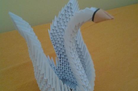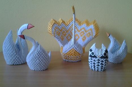 Výstava ručních prací seniorů v Lysé nad Labem nás inspirovala k výrobě origami 3D. Mezi naše první výrobky patří labutě. Základem je naskládat velké množství trojúhelníčků, s tím nám ochotně pomáhají i ostatní zaměstnanci. Naše výrobky se líbí a to nás motivuje k výrobě dalších tvarů: drak, sova, složitější labutě, .....