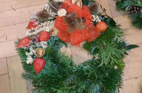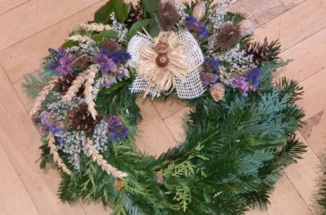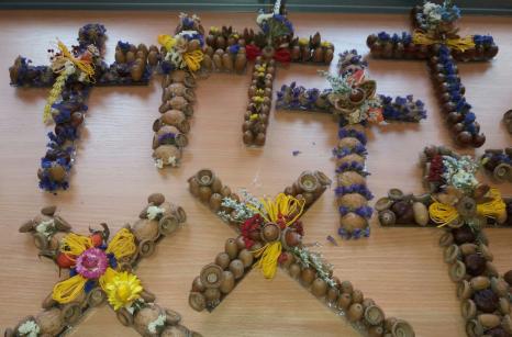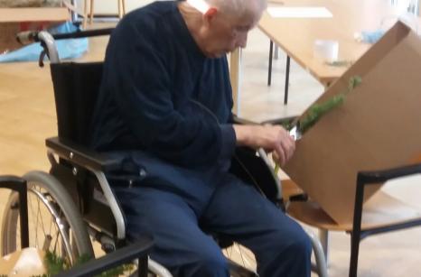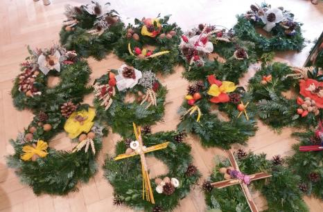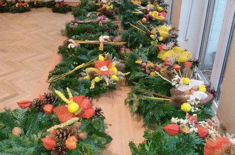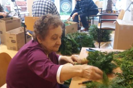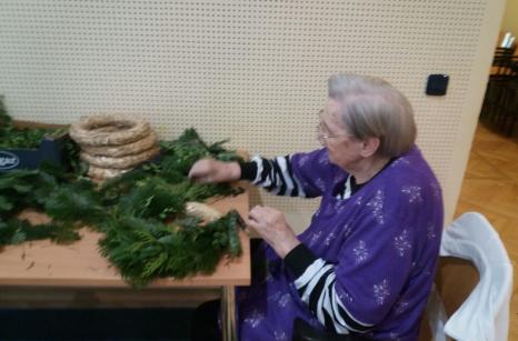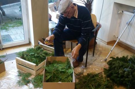 Od 17.-25.října probíhala v našem domově příprava a výroba dušičkových věnců a křížků. Jako každý rok se naši uživatelé na tuto práci moc těšili. Stříhání jedlové chvoje a tújí krásně provonělo náš domov na několik dní, navazování věnců procvičilo ruce našich šikovných dam a při práci panovala dobrá nálada. A výsledek posuďte sami...