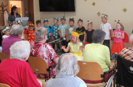 Paní učitelky s dětmi z MŠ A. B. Svojsíka si k svátku maminek připravily pásmo písniček, básniček a tanečků. Všichni přítomní byli z milého vystoupení dětí dojatí. Děkujeme dětem i učitelkám za návštěvu a za krásné dárečky, kterými děti obdarovaly obyvatele našeho domova.