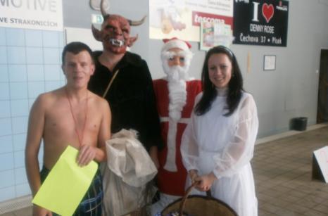 Jako již tradičně naše závody navštívili milí hosté – ČERT, ANDĚL A MIKULÁŠ,kteří byli velikým zpestřením celého sportovního klání. Společně předávali medaile vyrobené našimi uživateli v keramické dílně a diplomy vytvořené ve výtvarném ateliéru a každý byl odměněn chutnou čokoládou od sponzora, který si nepřál být jmenován. Tyto tři postavičky vnesli do celého sportovního klání moc dobrou náladu – někdo se jich trošku obával, ale někdo překonal svůj strach a třeba se s nimi vyfotil a největší odvážlivci dokonce sebrali odvahu a s hrůzostrašným čertem si i zatančili. Funkcí časoměřičů se tentokráte ujali studenti ze strakonického Gymnázia a hlavním startérem se pro letošní závody stala Mgr.Andrea Johnová, která společně se svými studenty ochotně a nezištně podpořila celou akci.