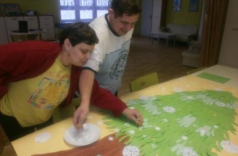 Letošní zima je pro nás ta opravdová, nechybí sníh ani pořádné mrazy, a tak jsme se rozhodli, že si ve stacionáři, společnými silami, vyrobíme zimní obraz, na kterém každý z nás zanechá své „otisky“ rukou. Zasněžený strom, který jsme vytvořili, je tvořen z obrysů našich rukou, které jsou zároveň jakousi symbolikou naší společné práce a společného soužití ve stacionáři.