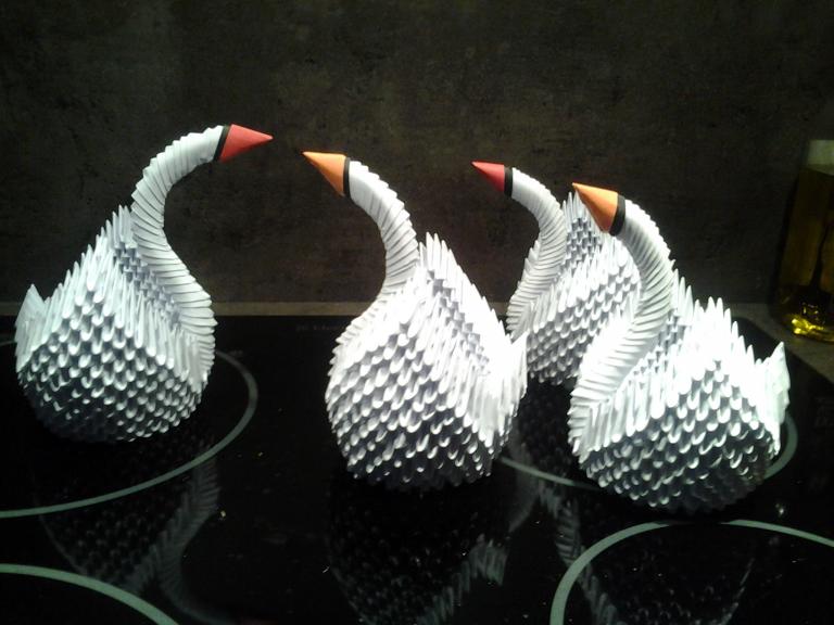 Výstava ručních prací seniorů v Lysé nad Labem nás inspirovala k výrobě origami 3D. Mezi naše první výrobky patří labutě. Základem je naskládat velké množství trojúhelníčků, s tím nám ochotně pomáhají i ostatní zaměstnanci. Naše výrobky se líbí a to nás motivuje k výrobě dalších tvarů: drak, sova, složitější labutě, .....