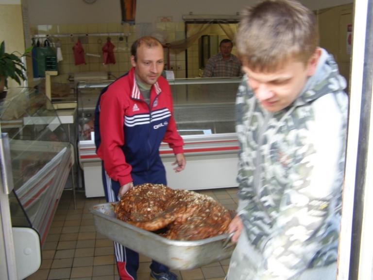 V pátek 2.9.2011 se opět po roce sešli uživatelé, rodiče a všichni přátelé Denního stacionáře pro mentálně postižené děti, mládež a dospělé ve Strakonicích, aby společně poseděli a užili si krásný den u tradičního rožnění prasátka. Tentokráte si dali dostaveníčko v krásném areálu PANSKÉHO DVORA v Řepici, kde celý den vládla prima nálada. Již do rána se na rožni otáčelo prasátko a čekalo na první hosty - uživatele Denního stacionáře, kteří dorazili kolem poledne v rámci turistiky. Na všechny hosty čekal nejdříve předkrm ve formě uzené kýty a výborných salátů /pro nás připravili manželé GROHMANNOVI z místní hospůdky/. Pak už všichni trpělivě čekali na chutné prasátko, které se otáčelo na rožni. I přes chvilkovou nepřízeň počasí byl během dne připraven dorovodný program pro zúčastněné. Nejprve se utkalo družstvo fotbalistů z Denního stacionáře proti zaměstnancům z MěÚSS v přátelském fotbalovém utkání, při kterém zažili fotbalisti i diváci spoustu legrace /výsledek 5:8 pro ředitelství/. Příjemným zpestřením byl další sportovně-společenský program, který byl připraven pro naše uživatele – sportovní soutěže, jichž se každý rád zúčastnil.