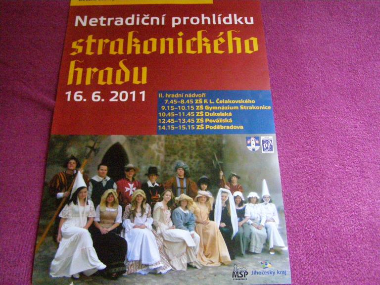 Dne 16.6.2011 uživatelé-turisté /dle zvolené možnosti v rámci aktivizačního programu/ Denního stacionáře navštívili netradiční prohlídku STRAKONICKÉHO HRADU. Tuto akci připravilo dětské zastupitelstvo STRAKONICE. „Zastupitelé“ vystupovali v dobových kostýmech. Představení začínalo v KAPITULNÍ SÍNI, pokračovalo přes hradní NÁDVOŘÍ JELENKU, MALÝ RYTÍŘSKÝ SÁL až zpět k nádvoří. Vystoupení doprovázeli ŠERMÍŘI a BÍLÁ PANÍ. Akce se všem líbila. Měli jsme možnost si prohlédnout interiér hradu i vystavované expozice.