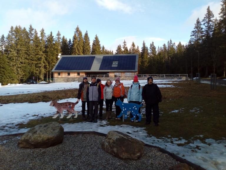 Tradičně jako každé úterý klienti stacionáře odjíždějí na Šumavu věnovat se běžeckému lyžování. Letošní zima má vrtošivý charakter. I přes to, že o víkendu panovaly ideální běžecké podmínky, do úterý veškerý sníh stačil roztát. Zvolili jsme alternativní řešení. Místo běžeckého lyžování klienti navštívili Návštěvnické centrum Kvilda. V areálu NC Kvilda se nalézá výběh s jeleny o rozloze cca 9 ha s pozorovacími věžemi. Výběhem i mimo něj vede naučný okruh, kde jsou na informačních panelech k vidění stopy či paroží jelenovitých. Dozvěděli jsme se například, jak se dá rozpoznat stáří jelenovitých. Všichni si prohlédli stopy prasete divokého či některé místní rostliny a stromy. Jelení stezka je dlouhá 2,5 km. Dalším lákadlem na stezce je 0,5 hektarový výběh zbudovaný pro handicapovaného rysa Davida, který v důsledku úrazu po střetu s autem a podrobení se dlouhodobé léčbě není schopen vrátit se volně do přírody.
