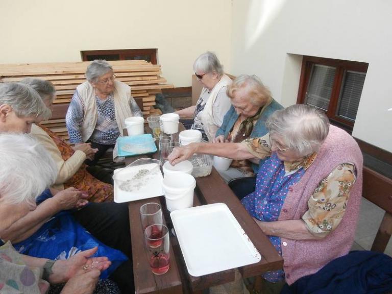 V pondělí dopoledne provoněla nádvoří vůně meduňky. Senioři otrhávali lístky meduňky z větviček. Usušené lístky později využijí pro přípravu vonných sáčků. Občerstvili se i nápojem z meduňkových listů a citronu. Ke zpříjemnění této činnosti přispělo i poslechové čtení o rodu Hildprantů.