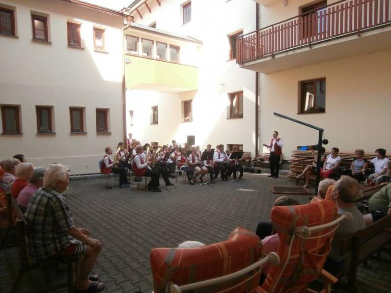 Na dnešní den jsme se všichni velice těšili. Do Domova přišly zahrát děti ze ZUŠ ve Strakonicích. Senioři poslouchali své oblíbené písničky nejen na nádvoří DS a na balkónech, ale i za otevřenými okny na chodbách a ve svých pokojích. Mladí hudebníci pod vedením p. Pilného vytvořili úžasnou atmosféru, která vybízela ke zpěvu. Škoda, že všechno musí jednou skončit. Hodinovou produkci všichni přítomní odměnili bouřlivým potleskem a děti dostaly jako pozornost zmrzlinový kornout. Uživatelé odcházeli do svých pokojů s rozzářenýma očima a úsměvem na rtech. „To bylo jako zamlada, přesně takhle hráli u nás doma." Milá kapelo, moc Vám děkujeme. Byli jste úžasní. Přijďte zas!