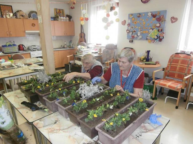 Z městského zahradnictví Strakonice nás velice potěšili krásným darem. Velkým množstvím macešek jsme společně osadili všechny truhlíky našeho domova a umístili na okna, kde každý den každého obyvatele těší svou krásou. Do osazování se zapojilo velké množství uživatelů. Někdo vyndával květiny a připravoval je na přesazení, jiný upravoval a dosypával hlínu, další sázel. Společně jsme vytvořili i dekoraci ke květináčům, jenž našli své místo přímo v jídelně.