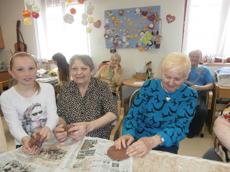 Po víkendu, tedy hned v pondělí zavítaly do domova pro seniory děti z DDM Strakonice. Tentokráte dostali klienti za úkol se pouze dostavit do tvůrčí dílny a činnost, jenž si pro ně děti z DDM Strakonice připravily, byla pro každého velkým překvapením. O to radostněji se pak všichni pustili do díla. Děti donesly veškerý potřebný materiál, tedy hlínu, kelímky a speciální "lepidlo". Paní učitelka vysvětlila postup a předvedla krásnou misku, kterou si uživatelé mohli vyrobit. Každý z klientů dostal svého "osobního poradce", jenž podával, radil a názorně předváděl postup. Společná práce pod rukama jen kvetla a výsledek na sebe nenechal dlouho čekat. Senioři si nemohli spolupráci vynachválit. Přátelská atmosféra zaplnila celý prostor.