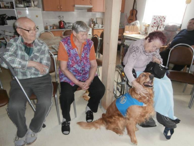 Fenka Sára už ví přesně, kam má jít. Jen co ji její panička, naše laskavá dobrovolnice, přivedla do domova, ihned zamířila ke schodům a za krátkou chvíli už se vítala s klienty. Každého očichat, olízat a pěkně se nastavit na pohlazení. Takováto pohlazení jsou pro obyvatele domova především pohlazením duše. Panička Sáry přidala pár veselých příběhů o Sáře a ta doplnila vyprávění brumláním a štěkotem, což pobavilo každého, kdo se rozhodl zúčastnit. Na rozloučenou poslušná fenka na povel ještě zaštěkala.