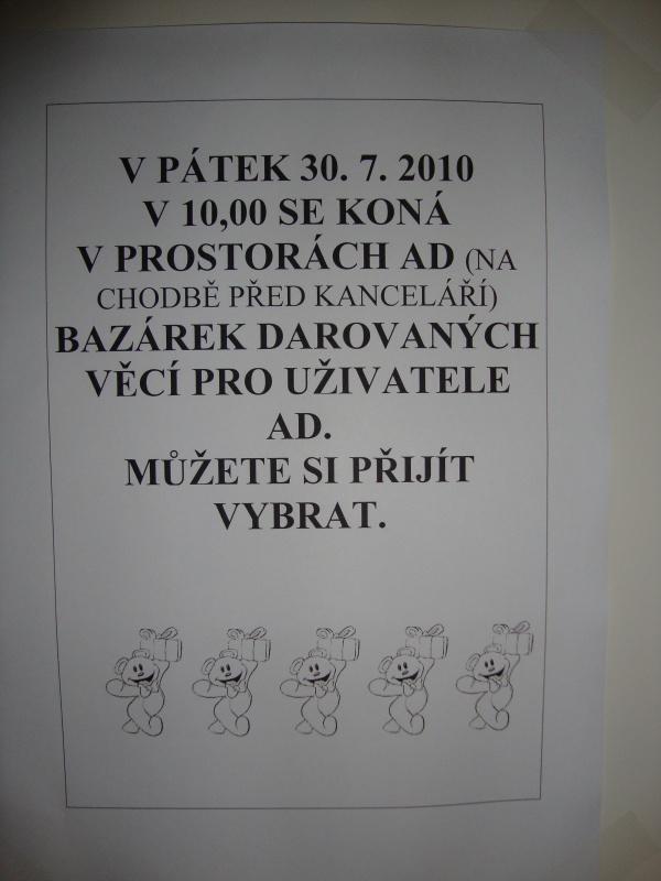 Akce bazárek se uskutečnila 30. 7. 2010 v prostorách AD. Převážně se jednalo o oblečení, které věnovali různí lidé pro uživatele AD.