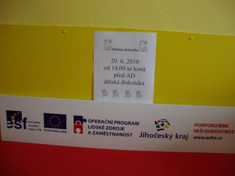 Dětská diskotéka se uskutečnila 20.6.2010 od 14,00 v prostorách před AD. Hudbu zajišťoval pan Grundza (uživatel AD)společně se sociálními pracovnicemi. Aparatura byla postavena před AD. Diskotéky se účastnily dětí z AD i děti z vedlejšího domu. Dospělí se též zapojili. Přestože počasí této akci nepřálo, účast byla hojná a moc se líbila.