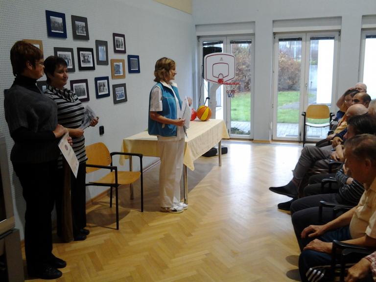 Paní Tichánková, koordinátorka akce pro Jihočeský kraj, nás v závěru soutěže opět navštívila. Společně s fyzioterapeutkou paní Evou Tomáškovou poděkovala všem 25 zúčastněným, předala jim diplomy a medaile. Při předání projevovali radost a dojetí. Jako krásný dárek náš domov získal finační prostředky, které jsme využili k zakoupení basketbalového koše a speciální hole na chůzi do terénu.